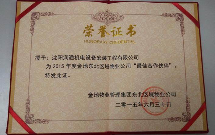 2015年6月30日,金地物業(yè)管理集團(tuán)東北區(qū)域物業(yè)公司授予沈陽潤通機電設(shè)備安裝工程有限公司為2015年度金地東北區(qū)域物業(yè)公司“最佳合作伙伴”榮譽證書,自2013年11月與金地名京一期、二期簽訂電梯維保合同至今,潤通人堅持24小時熱線不間斷,12個月度維保報告不松懈,年度電梯故障分析準(zhǔn)確到位,客戶響應(yīng)及時、到位等優(yōu)秀品質(zhì),獲得了業(yè)主的好評。這份榮譽不僅說明了我們的工作得到了客戶的認(rèn)可,更印證了我們的努力是值得的,同時更是鞭策我們不斷提高,深挖潛力的動力,讓我們不停的努力和改進(jìn)去完善服務(wù)內(nèi)容和服務(wù)品質(zhì),做專屬于潤通的優(yōu)秀維保服務(wù)。